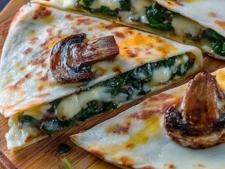 Distribute about half of each of the cheeses over half ofeach of the tortillas. Then layer the spinach, mushrooms, and the rest of the cheeses, and fold the