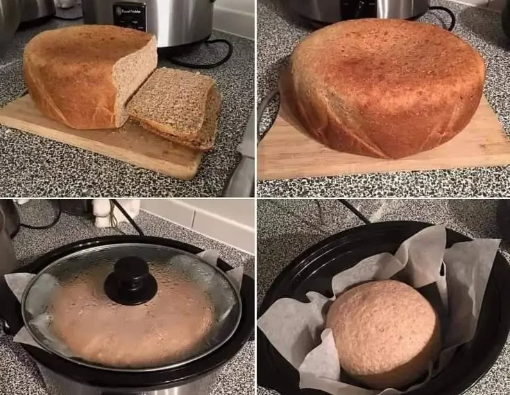 Line your slow cooker with cooking (baking) paper and place in your round ball of dough. I will rise in the slow cooker as it heats through. Cook on High power for 2- 2.5 hours. Start checking at every 7-10 minutes until top is sponge-y but springs back and no moisture on the top. The bottom should be a nice brown colour as well as sides. I put mine (just the loaf) in the oven on broil/grill for less than 5 minutes to get a nice crusty top too!