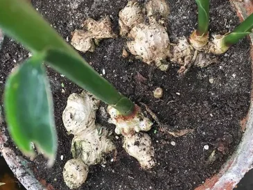 Place the rhizome in a shallow tray with water or damp soil in a warm, shaded area. Within a few weeks, small green shoots should appear, indicating it’s ready for planting.
